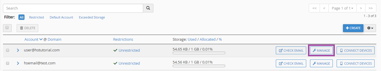 Kvotasını dəyişmək istədiyiniz elektron poçt hesabının qarşısında Manage düyməsini klikləyin: