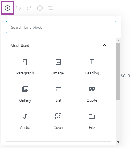 Yeni açılan səhifədə sol üst küncdə «+» düyməsini klikləyin. Açılan menyuda müxtəlif bloklardan ibarət açılan menyu görəcəksiniz: