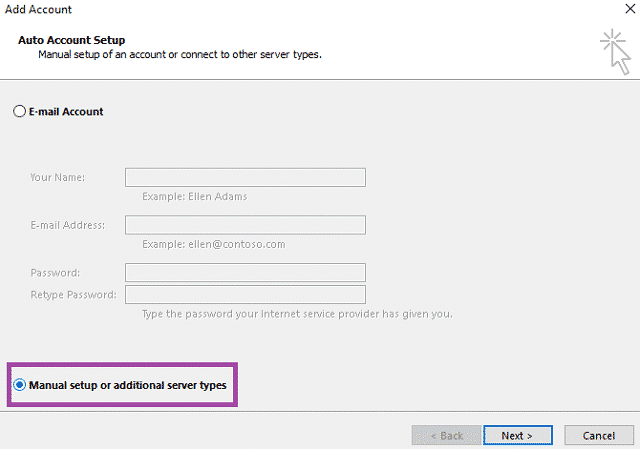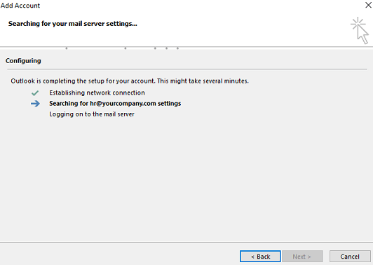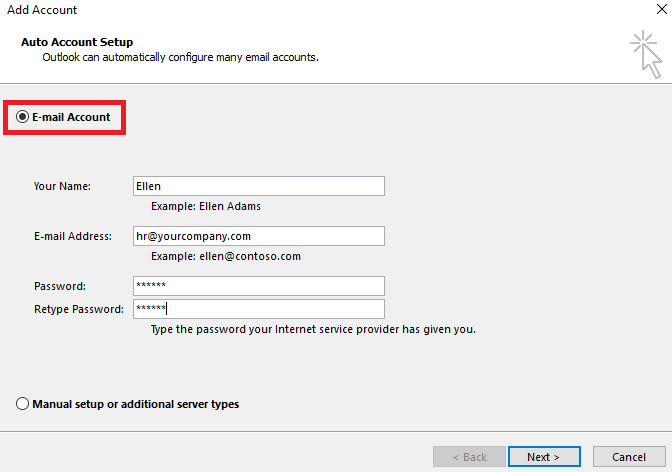 You can also let the outlook to do automatic configuration. So when you click to add an account, you need to select the first option that is Email Account and fill the information in the required fields and press Next.
