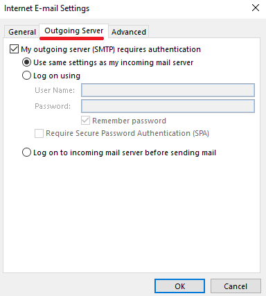 In more settings, click “Outgoing Server” tab and tick the option “More Settings” and select the radio button in front of “Use same settings as my incoming mail server” and click OK.