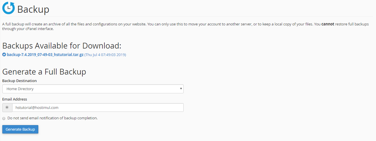 3. By default, a full cPanel backup will be saved into your account home directory.