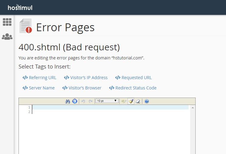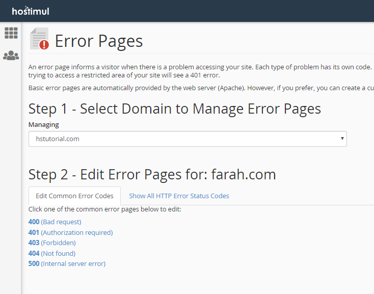 You can choose between 400 (Bad request), 401 (Authorization required), 403 (Forbidden), 404 (Not found), and 500 (Internal server error). Click the Show All HTTP Error Status Codes tab, to edit additional error codes.