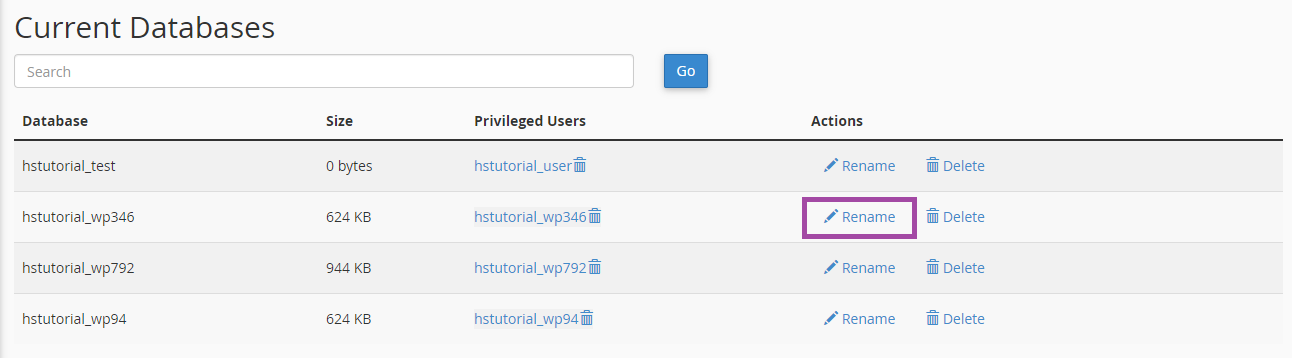 4. Find the database that you want to rename and click Rename button. It is important to remember the database user assigned to the database. You will need this information in the next steps.