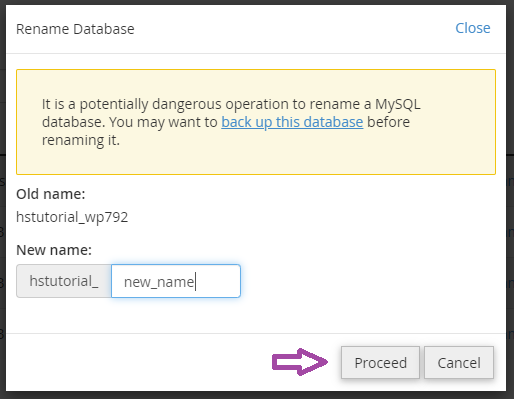 By using the most recent version of phpMyAdmin you will be able to change the database name. When changing the name of a database, it’s important also change user permissions and any scripts pointed to this database.