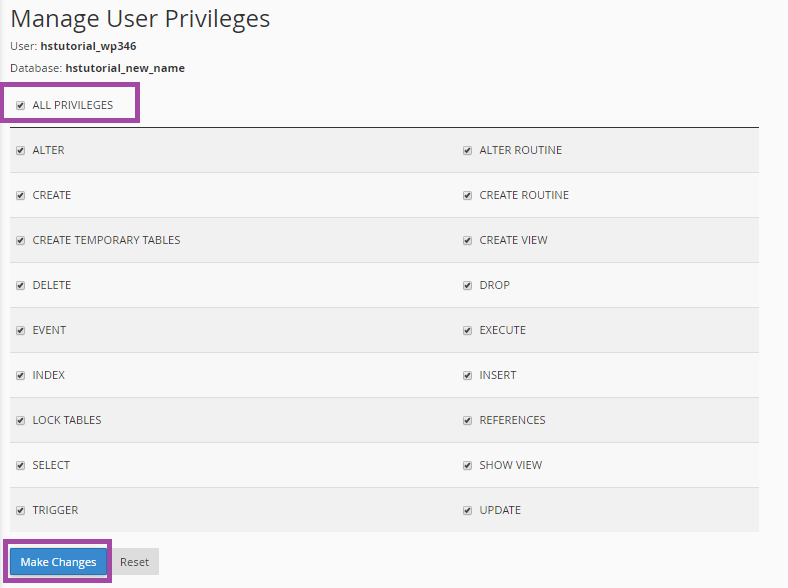 7. On the Manage User Privileges page that appears, check the box next to All Privileges: