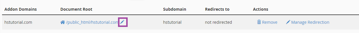 Внизу страницы, в разделе «Изменить домен» кликните на значок карандаша рядом с root-каталогом текущего документа для домена, который вы хотите изменить: