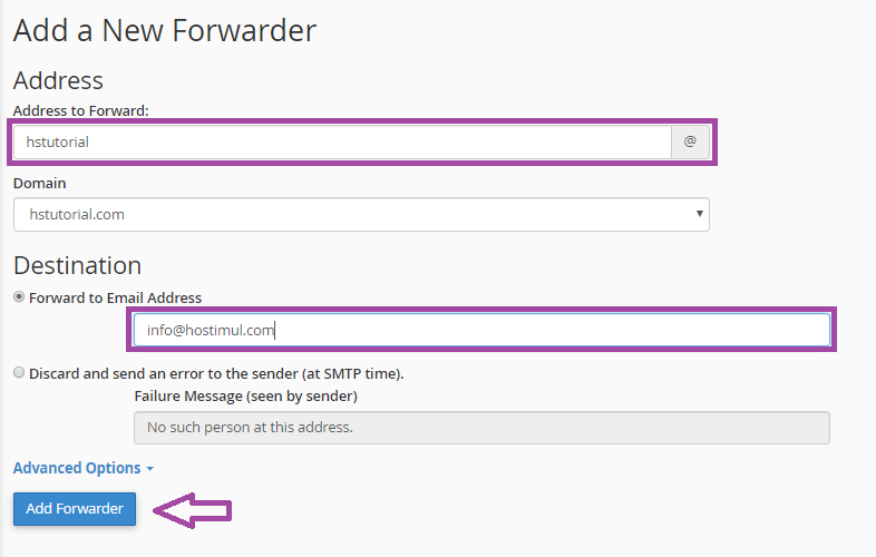 3. Заполните поля и, когда будете готовы, нажмите «Добавить пересылку»: