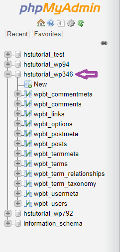 2. Выберите базу данных, которую вы хотите очистить. Список со всеми таблицами базы данных появится слева (у вас может быть только одна база данных, если размещен только один веб-сайт):