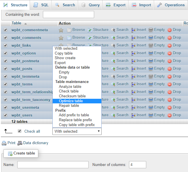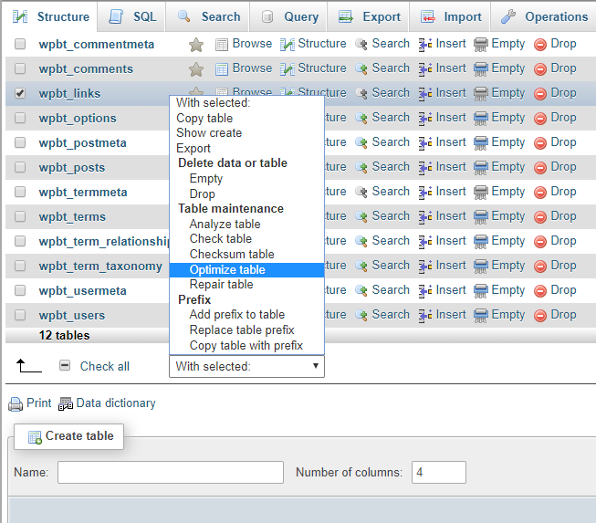 7. Отметьте нужную таблицу и выберите Оптимизировать таблицу в раскрывающемся меню, как показано ниже: