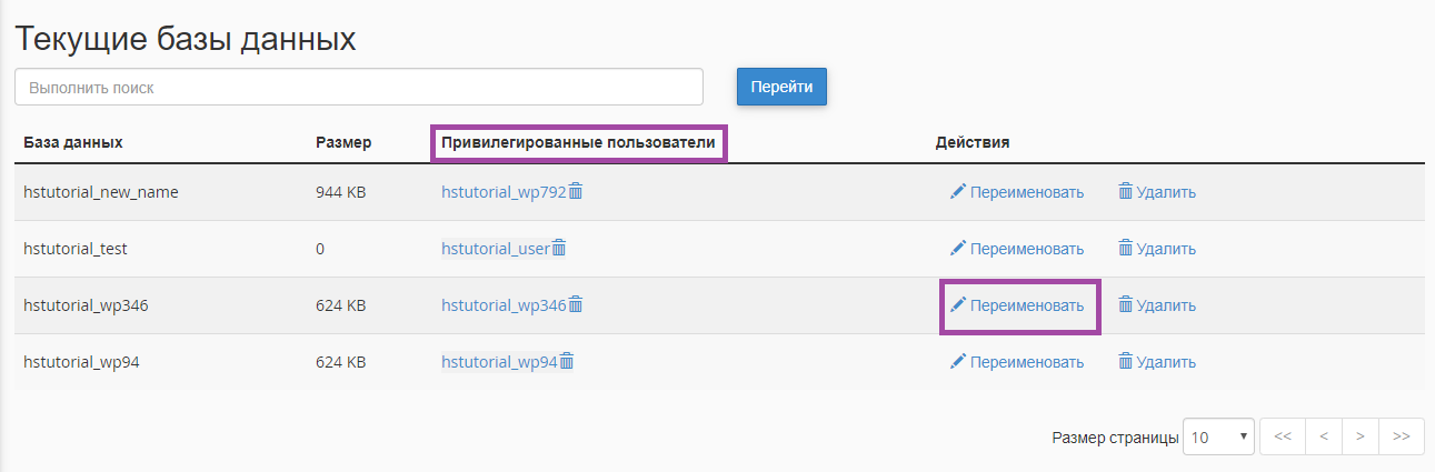4. Найдите базу данных, которую вы хотите переименовать и кликните на кнопку Переименовать. Запишите или запомните пользователя базы данных, уже указанного в базе данных. Эта информация понадобится вам при выполнении шага 2: