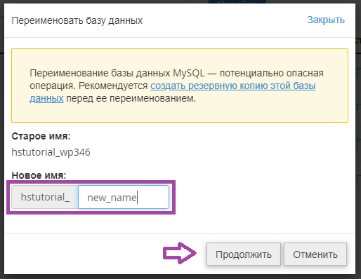 5. В новом окне введите имя новой базы данных и кликните Продолжить: