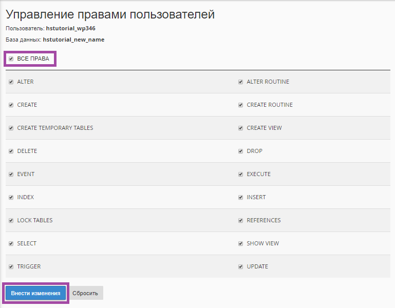 На появившейся странице Управление привилегиями пользователя установите флажок Все привилегии: