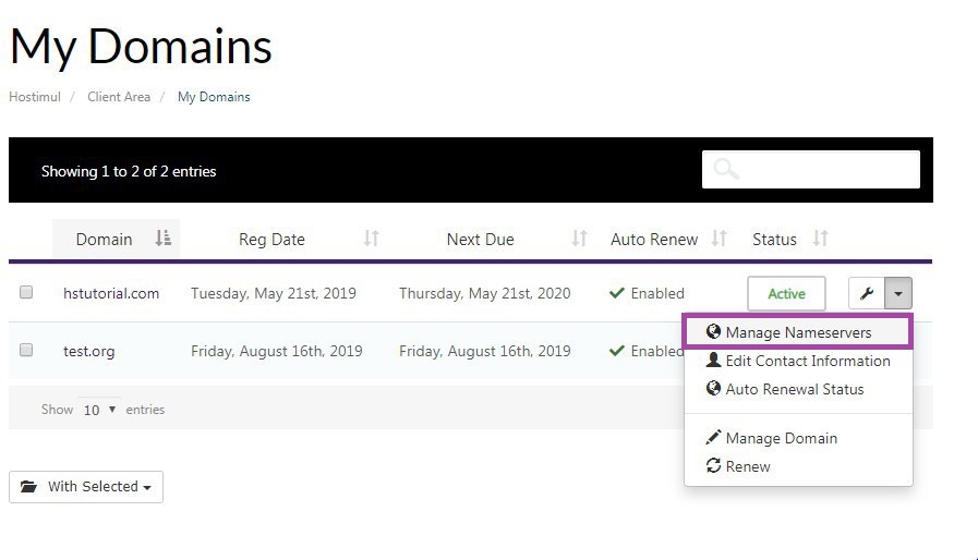 3. Выберите опцию «Управление неймсерверами» рядом с доменным именем, которое вы хотите привязать к CloudFlare: