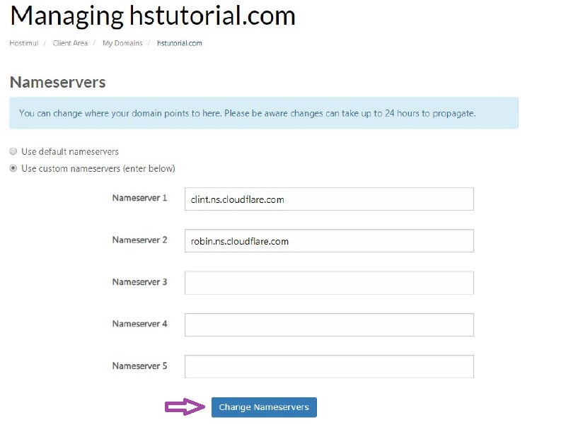4. На новой странице введите неймсерверы, указанные в учетной записи CloudFlare, затем нажмите Изменить неймсерверы: