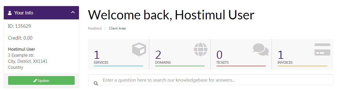 1. Войдите на сайт Hostimul. Кликните на кнопку «Панель клиента» в верхнем правом углу страницы: