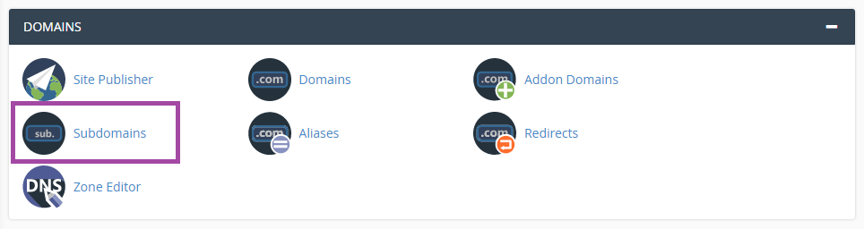1. Войдите в cPanel> раздел Домены> меню поддоменов: