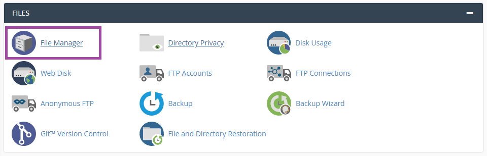 В разделе Файлы кликните на значок Диспетчер файлов: