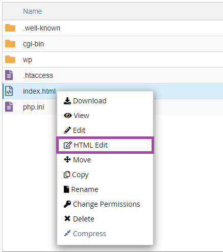 Кликните правой кнопкой мыши на значок index.html и выберите опцию «Редактировать HTML» в раскрывающемся списке: