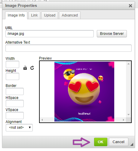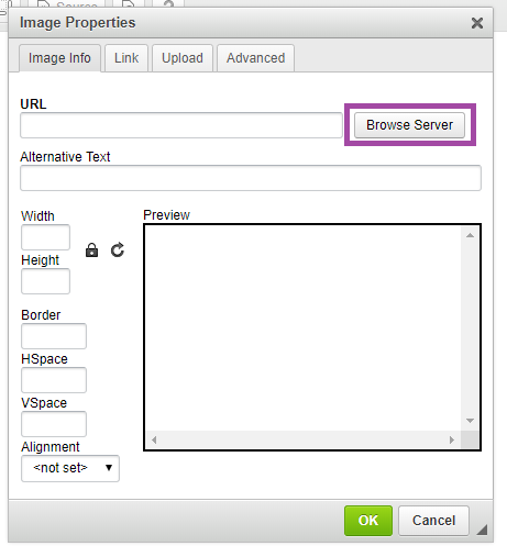 Появится всплывающее окно с параметрами для управления изображением, которое вы хотите включить. Пожалуйста, нажмите Обзор сервера, чтобы выбрать изображение, хранящееся на сервере: