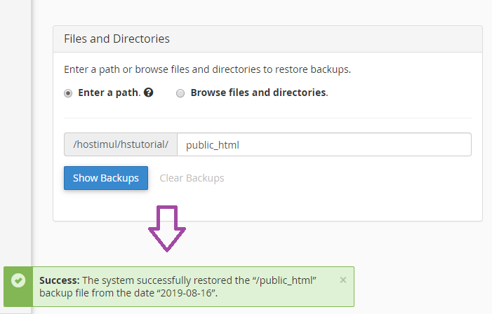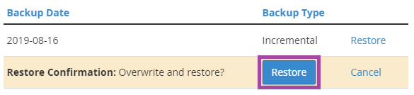 cPanel попросит вас подтвердить, нажмите «Восстановить» для подтверждения. Сообщение об успехе или неудаче будет отображаться в зависимости от результата.
