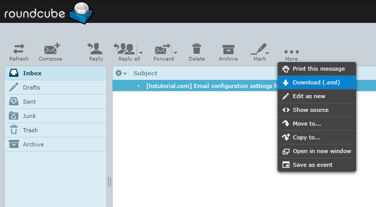 ПРИМЕЧАНИЕ: Файлы .eml поддерживаются большинством служб электронной почты. К сожалению, Roundcube не предоставляет удобных функций для загрузки сразу нескольких электронных писем, поэтому, если вы хотите создать резервную копию всей папки или учетной записи, мы рекомендуем использовать Horde.