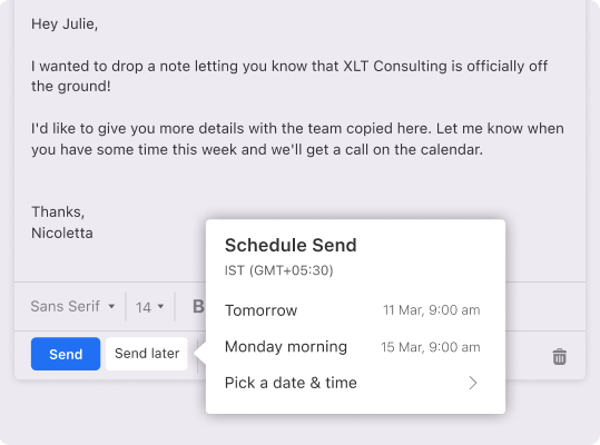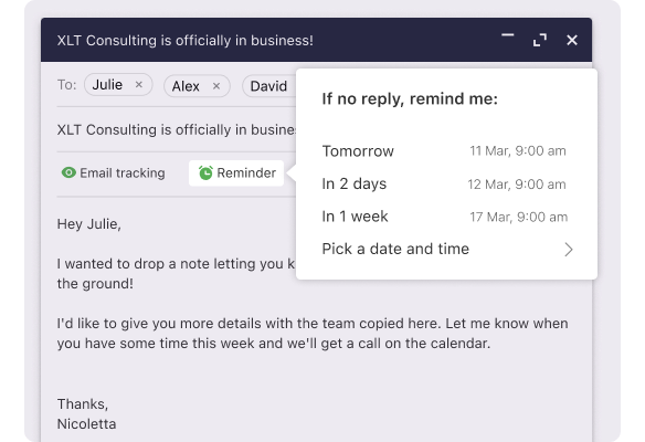 Never drop the ball midway through a conversation with Follow-up Reminders that let you circle back on important emails at the right time, every time.