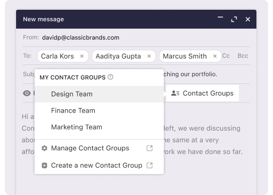 Group frequently emailed recipients to reach out to them simultaneously, so you no longer have to add each email address when composing a new message.